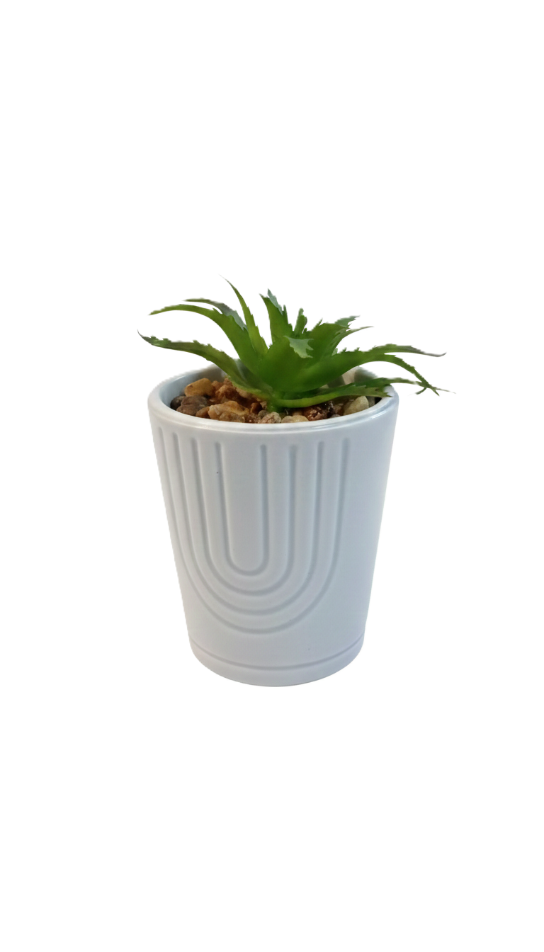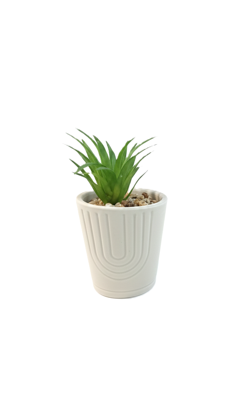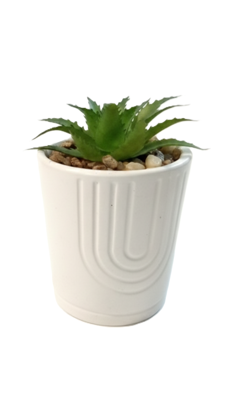 עציץ מלאכותי קטן הכולל צמח סוקולנט מסוג סנסיווריה עם תבליט אנכי מעוגל בחלקו התחתון.