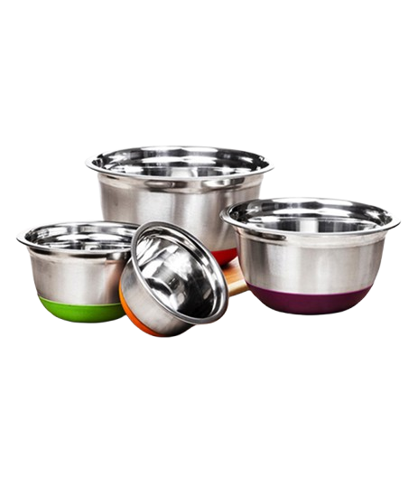 קערת ערבוב מנירוסטה עם בסיס סיליקון שטוח ושוליים רחבים לאחיזה, יציבות ונוחות העבודה