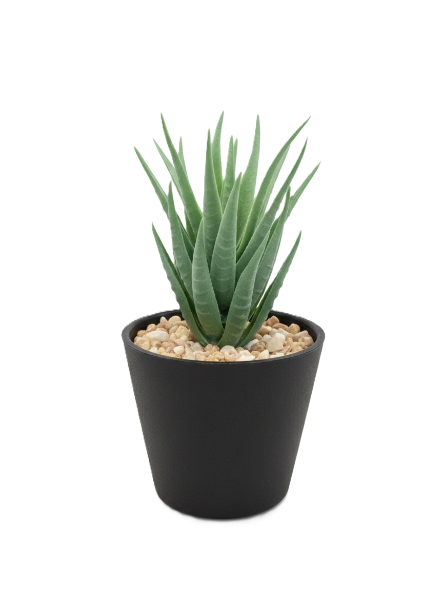 עציץ סוקולנט מלאכותי מסוג אלוורה, המיועד כפריט נוי לבית או למשרד.