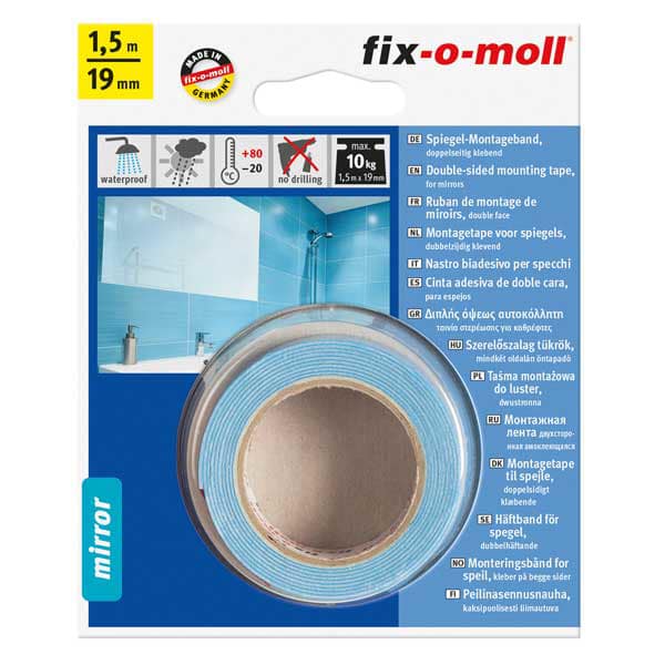 סרט דבק דו-צדדי איכותי מבית Fix-O-Moll, המיועד במיוחד להתקנת מראות על מגוון משטחים – בקלות, במהירות וללא צורך בקידוח. מתאים לשימוש בתוך הבית וגם באזורים לחים כגון חדרי רחצה ומטבחים.